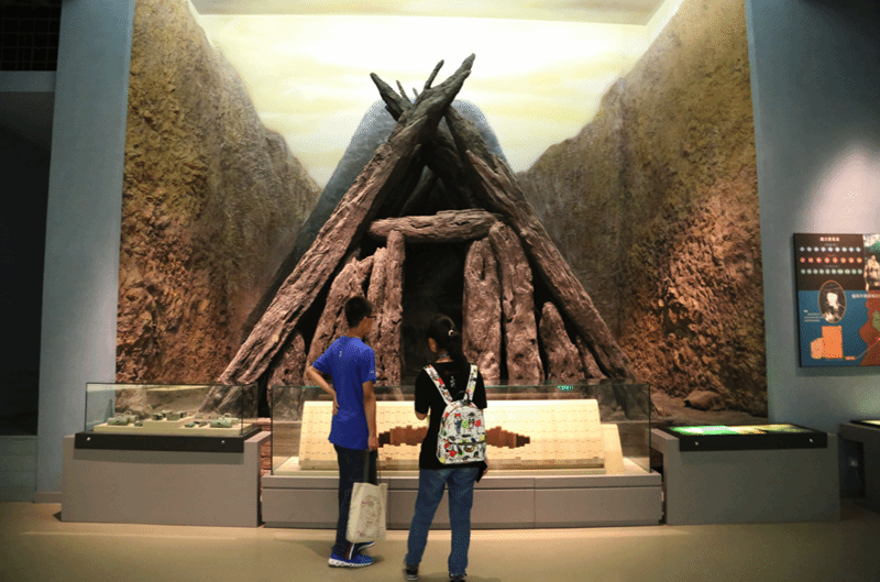 两位营员站在印山越王墓的仿制品前,别着急呀,咱们后天就去拜访真正的印山越王墓木客大冢
