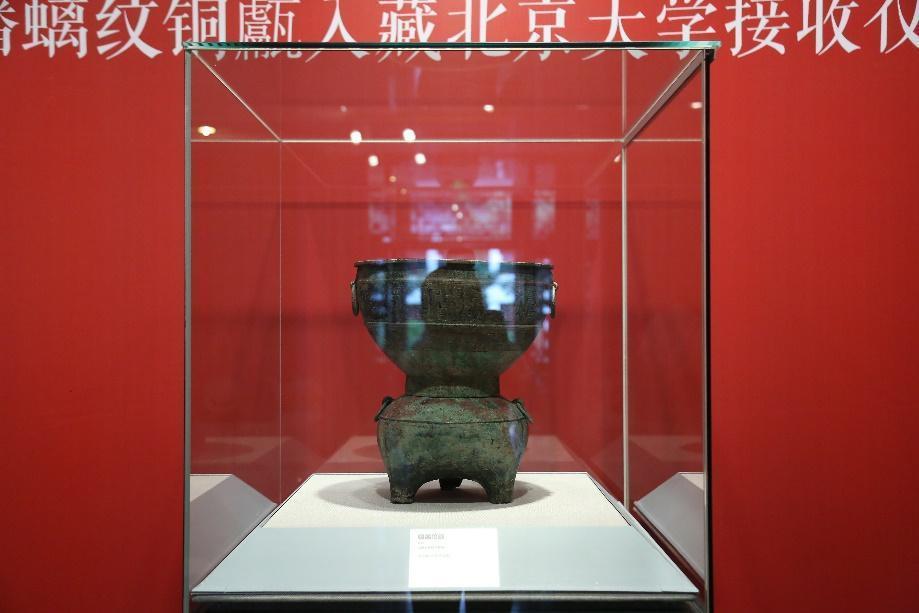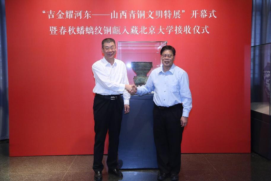 邱水平、张复明共同为春秋蟠螭纹铜甗揭幕。春秋蟠螭纹铜甗是国家二级文物,经国家文物局特别批准,由山西省调拨北京大学入藏,将成为北京大学考古学科珍贵教学标本与赛克勒考古与艺术博物馆的重要馆藏。该文物纹饰细腻、工艺精细,具有典型的晋式青铜器风格,对于推动学科建设与人才培养、开展中华优秀传统文化教育具有重要意义。