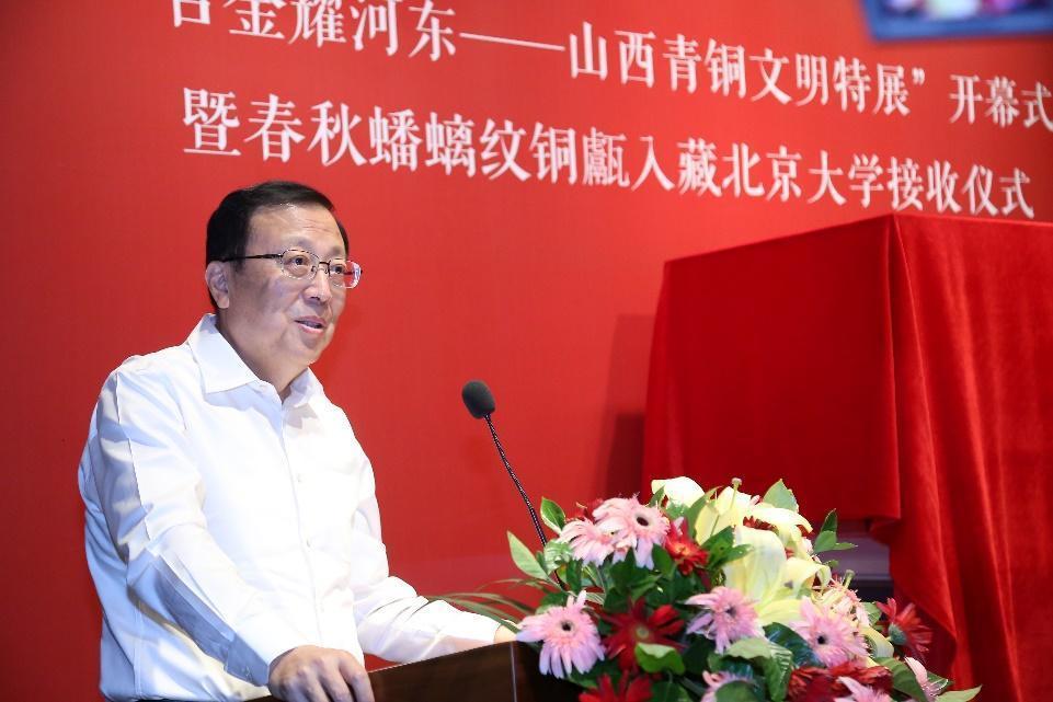郝平指出,此次特展汇聚了百余件组商周时期的青铜器,从最早的二里头文化青铜酒器到精巧绝伦的战国礼器,不仅具有极高的工艺和美术价值,更引发我们对于从波澜壮阔的历史变迁中继承弘扬中华优秀传统文化的深层思考。他表示,北京大学和山西在考古领域的合作源远流长,自1950年北大学者第一次踏入山西开展文物考古工作以来,从田野考古到古建勘察、文物保护、科技考古和文化遗产研究等,双方的考古合作不断丰富拓展。近年来,山西省考古事业蓬勃发展,发掘工作硕果累累,其中也有北大师生的广泛参与,一些重要成果也体现在本次展览中。郝平相信,北大师生在参观展览后一定能够切身感受到山西人民对北大师生的深情厚谊,同时对博大精深、灿烂辉煌的中华文明有更加全面而深刻的了解。