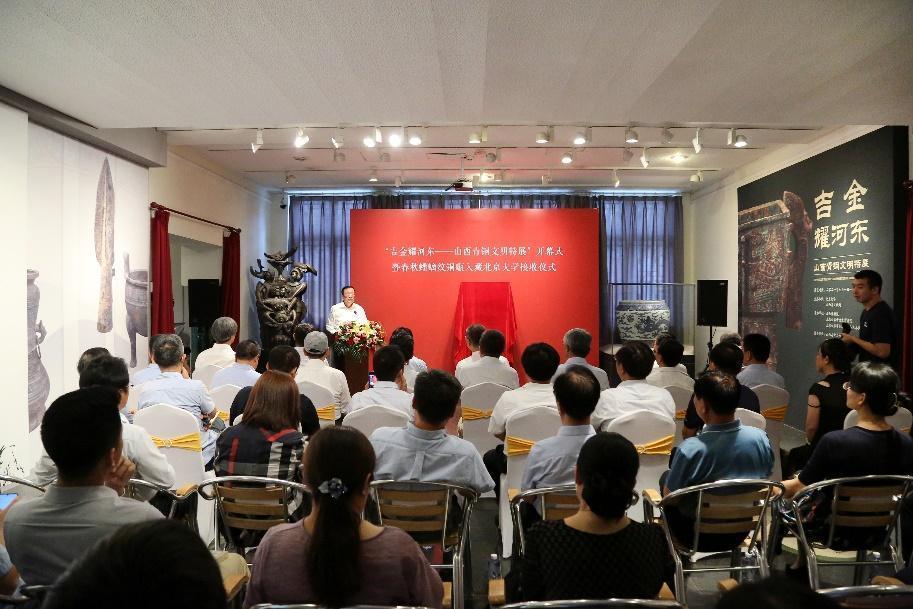 7月8日下午,“吉金耀河东——山西青铜文明特展”开幕式暨春秋蟠螭纹铜甗入藏北京大学接收仪式在赛克勒考古与艺术博物馆大厅举行。北京大学党委书记邱水平,校长郝平,国家文物局副局长关强,山西省副省长张复明,北京大学副校长王博,校长助理、秘书长孙庆伟出席。开幕式由王博主持。