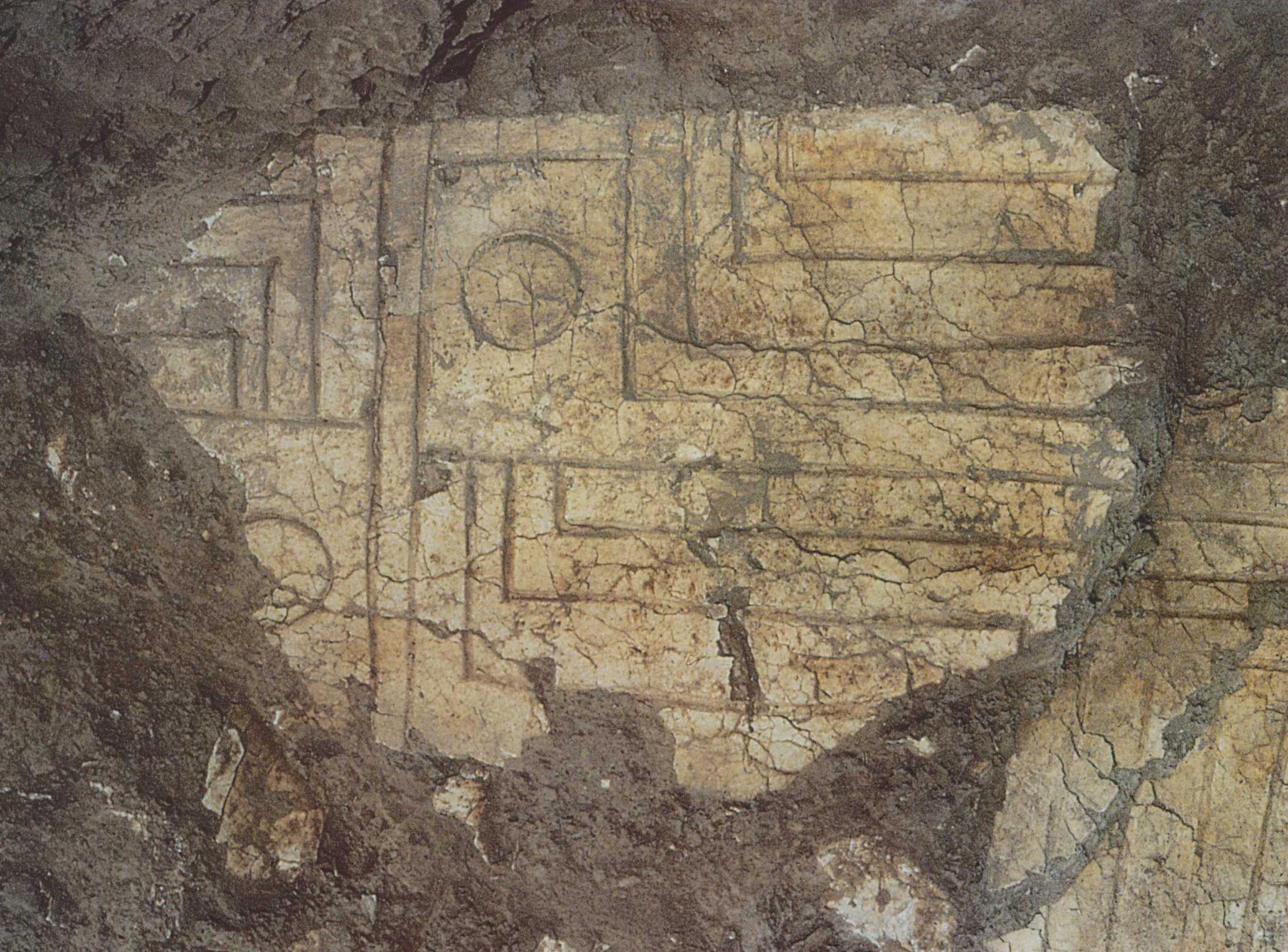 陶寺文化大型建筑残迹——几何图案白灰墙皮(中国社会科学院考古研究所、山西省临汾市文物局编著《襄汾陶寺——1978~1985年考古发掘报告》彩版六,文物出版社,2015年)