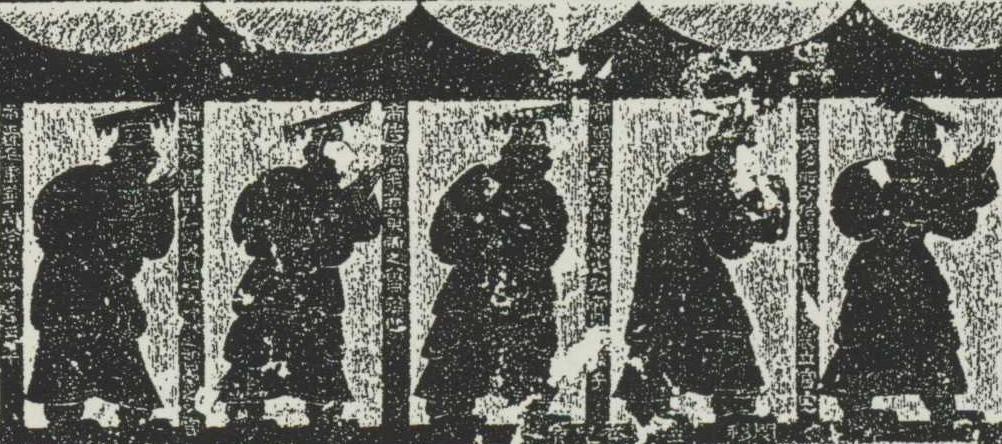 武梁祠西壁画像中的黄帝、帝颛顼、帝喾、帝尧、帝舜形象(中国画像石全集编辑委员会:《中国画像石全集1 山东汉画像石》,图版29页,文物出版社,2000年)