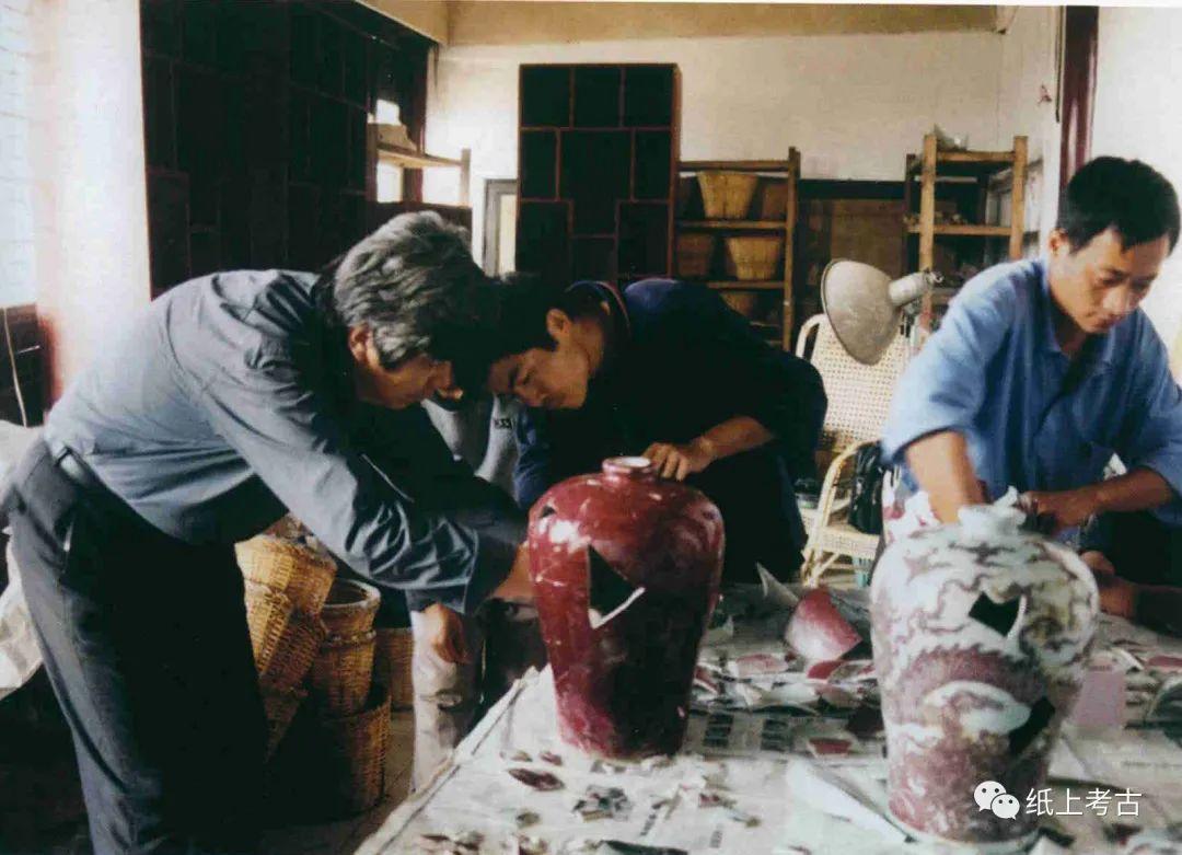 图十六 2003年权奎山教授在景德镇市陶瓷考古研究所与工作人员修复出土瓷器