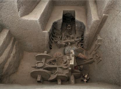 墓葬均为东西向。墓葬形制主要可分为:中间有斜坡墓道两侧为九级台阶的竖穴土坑墓、阶梯式墓道的竖穴偏洞室墓、竖穴土坑墓和竖穴棺坑墓等类,以竖穴偏洞室墓为大宗。竖穴偏洞室墓以台阶的多寡可分为九级、五至七级、三级台阶等不同等级。墓葬依等级不同随葬有一至五辆数量不等的车辆, 而且墓葬的等级越高随葬的车辆装饰就越华丽。墓葬绝大多数都有殉牲,以马、牛、羊为主。部分墓葬在地表以马头、牛头祭祀。在墓地中部和东部各有1 座祭祀坑,分层埋葬有马、牛、羊的头骨和蹄骨。