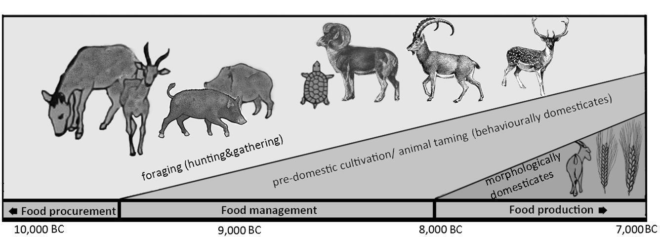 在伊朗以西的黎凡特等地,已有证据表明,旧石器时代末期(大约公元前20,000-12,000年)气候干冷,人们过着狩猎-采集的生活,对于种子和果实等自然资源的采集是人类食物的重要来源。生活方式依然是流动性的,但可能已经出现了半定居的生活模式。之后的纳吐夫文化时期(大约公元前12,000-9,600年),黎凡特南部地区已经出现定居聚落,且面积明显较大,有意识的埋葬行为和精巧的工艺品和装饰品也开始出现。生业经济方面主要依赖野生动物和植物资源,对动植物的人工栽培可能也已经开始。大体与新仙女木期的最晚阶段相当,即在公元前9600年前后,西亚地区开始进入新石器时代。