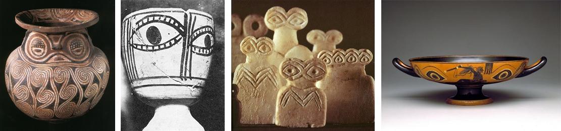 第三,贝格利从人类的生物进化和艺术家的心理活动角度,揭示了青铜器目纹演变的驱动力。罗越的风格序列告诉我们,大家熟悉的饕餮纹,在最早的铜器上仅是一双眼睛而已。贝格利试图探明为什么偏偏放上一双眼睛。他通过比较发现,在世界各地的艺术传统中都能发现这种双目纹,从西亚到巴西,从古到今。贝格利认为如果一个题材是普天之下都常见到的,而使用这些题材的人群却未必都有直接或间接的接触,那么我们就得用一个放之四海而皆准的理由来解释它的发明。这就涉及到人的共性,贝格利进一步解释到,眼睛在不受主观意识支配的情况下,有着自动控制人们注意力的能力。这种能力是生物进化所带来的,我们生来就对注视着我们的眼睛有着高度的警惕性。
