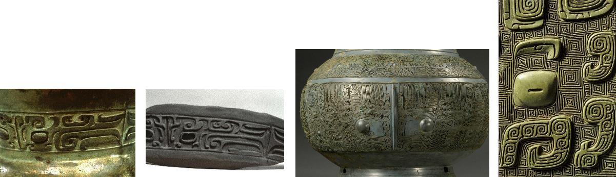 1赛克勒藏斝细部 2赛克勒藏斝细部橡皮泥翻印 3城固出土瓿 4大都会藏方彝细部