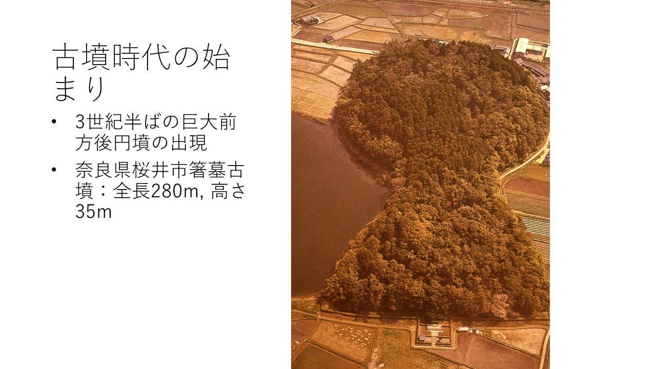 在古坟出现前后,日本的考古学文化发生了许多变化,主要有环濠聚落消失,贵族居住的高等级房屋出现;铜铎祭祀活动终止;以九州北部地区为中心分布的铜镜向以畿内(奈良、大阪、京都)为中心转变等等。在此背景下,典型的古坟开始兴建,其具备弥生时代墓葬所不具备的一些属性:如坟丘的高度很高;坟丘的形态、内部埋葬设施、随葬品的组合等方面具有超越地域的类似性;坟丘的建造有一定规格,小坟丘与大坟丘间多存在1/2,1/3,1/6的比例关系;葬具为又长又大的木棺;随葬大量的东汉镜和三角缘神兽镜等等。
