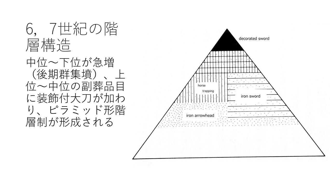 古坟时代后期,象征权力的随葬品也在发生变化。在5世纪的最后25年,随葬马具是高等级的标志,上层统治者随葬装饰马具和长甲胄,中层统治者仅有少数随葬马具,大多数随葬短甲胄,低层统治者仅随葬铁箭头、刀等。而到6世纪前半叶,甲胄和马具的重要性发生逆转,即随葬甲胄标志着更高的地位,上层统治者随葬一组甲胄和装饰马具,中层多随葬马具,低层则仍然随葬箭头和刀。6世纪后半到7世纪初,中层到低层的古坟数量增加,形成了群集坟,上层到中层的随葬品增加了带装饰的大刀,金字塔式的阶层结构形成。