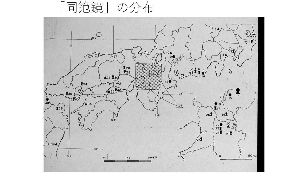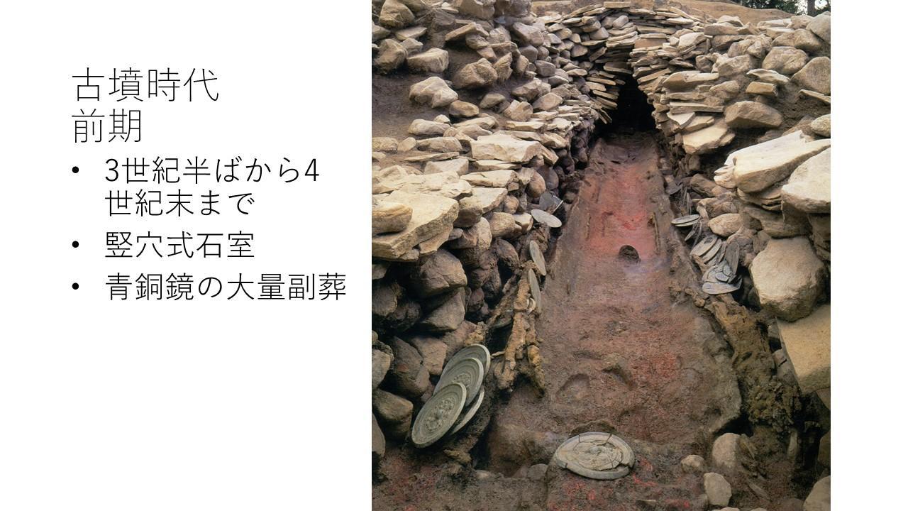 古坟时代前期约为3世纪中叶至4世纪末,墓室多为竖穴石室,墓葬中随葬大量铜镜。该时期墓葬之间差异明显,这种差异既有坟丘形式上的,可分为前方后圆形、前方后方形、圆形、方形等多种类型,也有墓葬规模上的,如奈良盆地东南部的大和古坟群,在古坟出现之时便出现了200米以上的巨大前方后圆坟、120米左右的前方后方坟、圆坟方坟这三种贵族阶层的古坟,而这种情况在其他地区不存在。古坟中常出土的三角缘神兽镜中,有一些同范镜,如黑塚古坟出土的三角缘神兽镜的同范镜在西到九州的丰前石塚山古坟,东到群马县的三本木古坟群这一很大的范围内皆有出土,可据其分配关系推断背后的大范围关系网。这种接受首长持有物的复制品的行为,表现出地方首长对中央首长的感恩之情,同时也产生出上下级的关系。