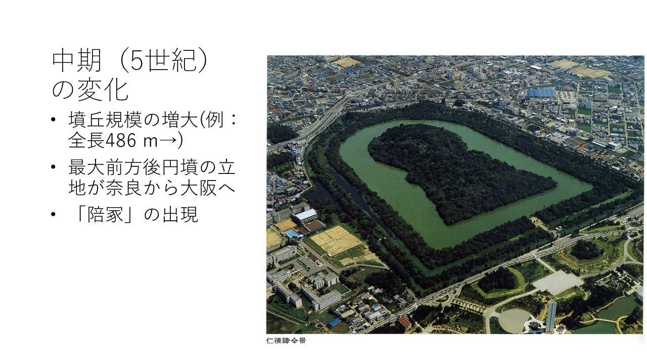古坟时代中期的时间约为5世纪,其主要特征为坟丘的规模增大、出现陪葬墓、多随葬长持形石棺和铁质护甲以象征权力。在这一时期,最大型的前方后圆坟从奈良盆地向大阪平野地区移动,形成了百舌鸟古坟群和古市古坟群等,对这种移动的解释,有墓域移动说(墓葬移动,但王权一直在大和地区)、政权交替说(政权从大和王权转移到河内王权)、大和王权内部的盟主权移动说三种说法。