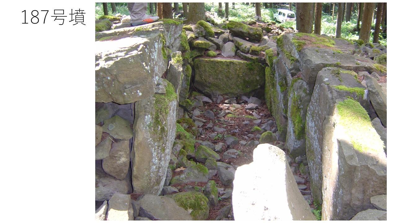 大室古坟群中,比较重要的有5世纪后半的木几纳告路(ムジナゴーロ)单位支群。该墓群中5世纪后半的墓葬为积石冢与合掌形石室,其中的168号坟中出土了马形陶器,可与平安时代的《延喜式》(10世纪左右)里记载的大室官营牧场相联系。6、7世纪的墓葬为横穴式石室,其中的187号坟墓葬形制较特殊,墓室左右壁的石头为侧立,这种摆放方式在日本很少见,反而在韩国有所发现。