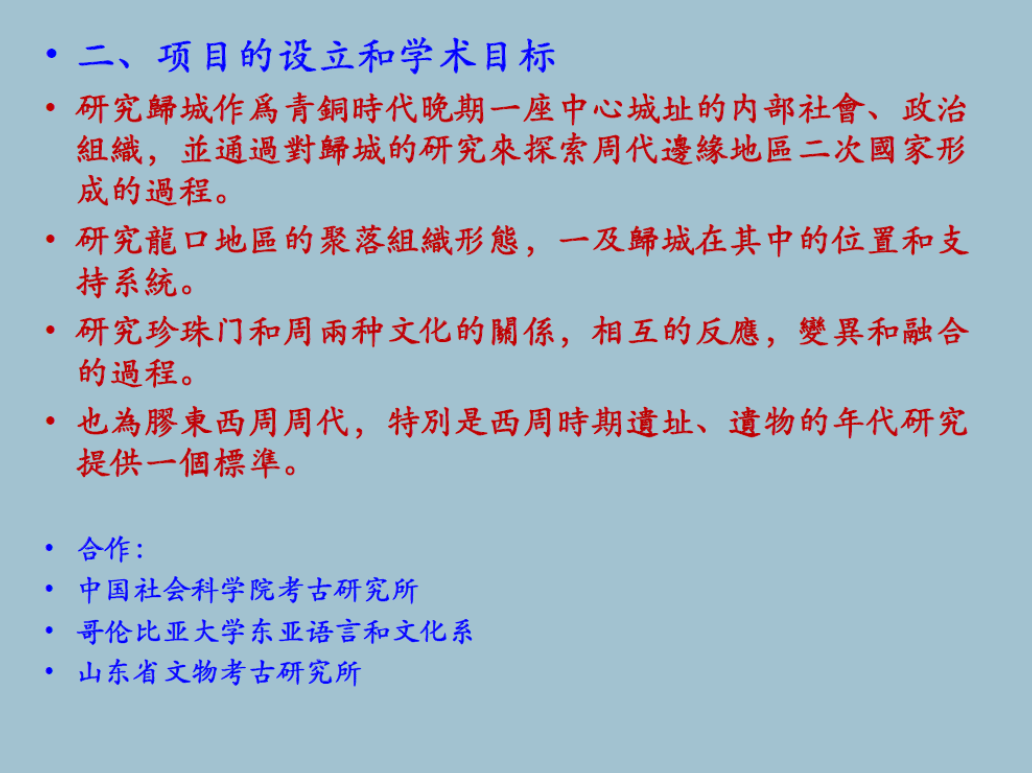 之后,李峰教授分享了归城遗址调查项目的学术目标及田野工作。学术目标共四点。其一,研究归城作为青铜时代晚期一座中心城址的内部社会和政治组织,并通过对归城的研究来探索周代边缘地区二次国家形成的过程。其二,研究龙口地区的聚落组织形态,以及归城在其中的位置和支持系统。其三,研究珍珠门和周两种文化的关系、相互的反应,以及变异和融合的过程。其四,为胶东周代,特别是西周时期遗址、遗物的年代研究提供一个标准。