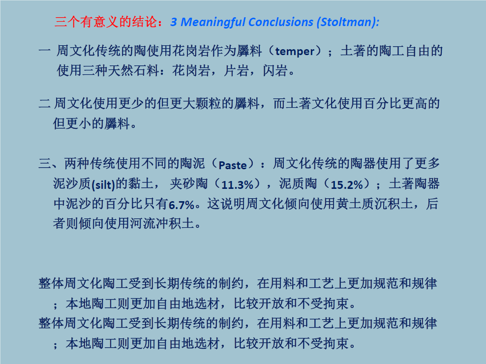 此外,李峰教授亦通过项目所获取的资料讨论了归城地区两种文化的生产系统。首先从归城遗址陶片的存在状态切入,指出珍珠门文化陶器分布在归城全域,且比例从第一阶段至第三阶段逐渐增加。为了解归城本地文化与周文化的陶器是否属于同一生产系统,李峰教授分别对两类夹砂陶进行胚体及陶泥值分析,结果如下。第一,周文化传统的陶器使用花岗岩作羼料,而土著的陶工则使用花岗岩,片岩和闪岩这三种天然石料。第二,周文化使用更少但更大颗粒的羼料,而土著文化使用更多的但更小颗粒的羼料。第三,两种传统使用不同的陶泥,周文化陶器使用了更多泥沙质(silt)黏土,而土著陶器则相反,代表周文化倾向使用黄土质沉积土,后者则倾向使用河流冲积土。李峰教授对上述现象进行总结,认为周文化陶工受到长期传统的制约,在用料和工艺上更加规范和规律,而本地陶工的选材则更加自由、开放、不受拘束。