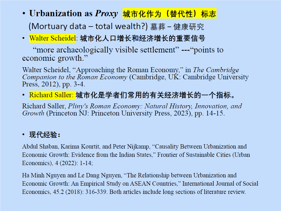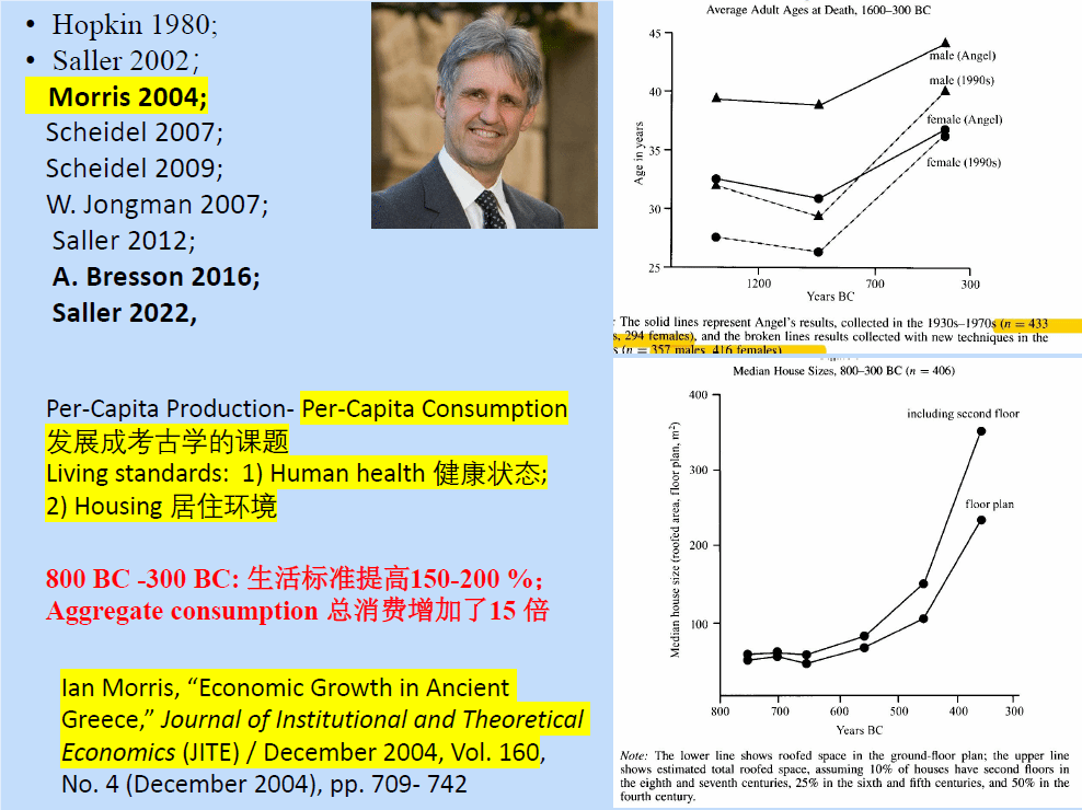 讲座先以历年来西方学者对古罗马经济的研究为例,论述了古代经济增长议题的学术史。英国剑桥大学古代史学家基思·霍普金斯(Keith Hopkins)于1980年撰文,将古罗马的经济称为“税收-贸易模式(Taxes-Trade model)”,其表现为实行货币税(Money tax)、通过本地交易以获得货币等(Hopkins,“Taxes and Trade in the Roman Empire (200 B.C.-A.D. 400)”, 1980.),学界亦普遍认为当时的古罗马已出现经济增长。后美国斯坦福大学教授理查德·萨勒尔(Richard Saller)从总增长(Aggregate Growth)及人均增长(Per-Capita Growth)两种角度分析古罗马经济增长状况(Saller,"Framing the Debate over Growth in the Ancient Economy", 2002.),古代经济增长开始转为一专门研究领域。英国历史及考古学家伊安·莫里斯(lan Morris)通过希腊墓葬研究古希腊的经济与社会结构,并提出可从健康状态、居住环境等与生活水平相关的角度分析希腊经济增长(Morris,“Economic Growth in Ancient Greece”,2004.)。自此,古代经济增长这一议题发展成考古学课题。