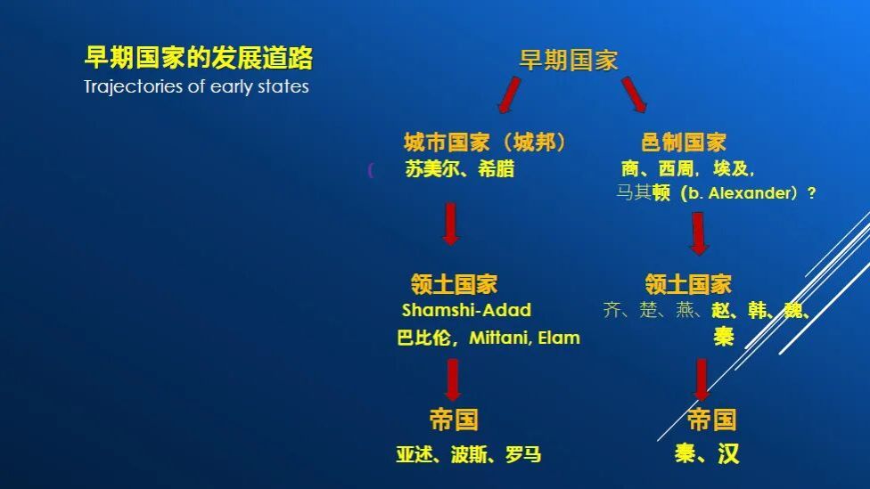 而同为群雄割据混战的中国春秋战国时期,中国也开始由“邑制国家”走向“领土国家”(territorial state),这也是进一步走向帝国行政体系发展的关键。李峰教授结合考古和文献材料对这一发展脉络进行了梳理,指出县和城墙是这一时期的两项重要发明:前者彰显新官僚体制的形成,国家对地方由领土控制走向领土行政;后者既是防御系统,又成为了新的战争压力的来源。“战国七雄”就是典型的“领土国家”,具有明确的疆界和基层行政体系。作为新出现的国家形态,这一时期的古代中国又可以与近东地区古代的“领土国家”相对比:它们都将自己当作拥有连续国土的地理政治单元;在处理对外关系时都认同自己是一个大的国际政治体系中的一员,并都采取了类似合纵连横的方式。
