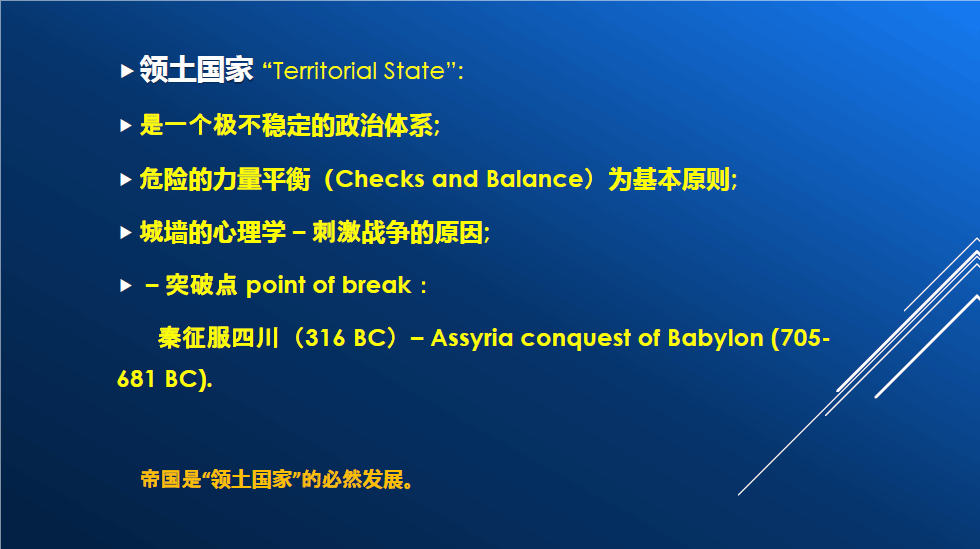在广泛比较其他世界古代文明的基础上,李峰教授对“领土国家”的特点进行了总结,指出它们大都拥有强大的中央行政、系统化的“领土行政”,清晰的国界和统一的法律、赋税制度,都有边防军队,以保卫领土和开辟疆土为使命。这样的国家注定是一个极不稳定的政治体系,各国都会以扩张领土来作为自身的保障,从而形成了一种危险的力量平衡。一旦平衡被打破,新扩张的领土被不断地设立郡县,最终统一的国家就形成了帝国。亦即帝国是“领土国家”发展的必然结果。