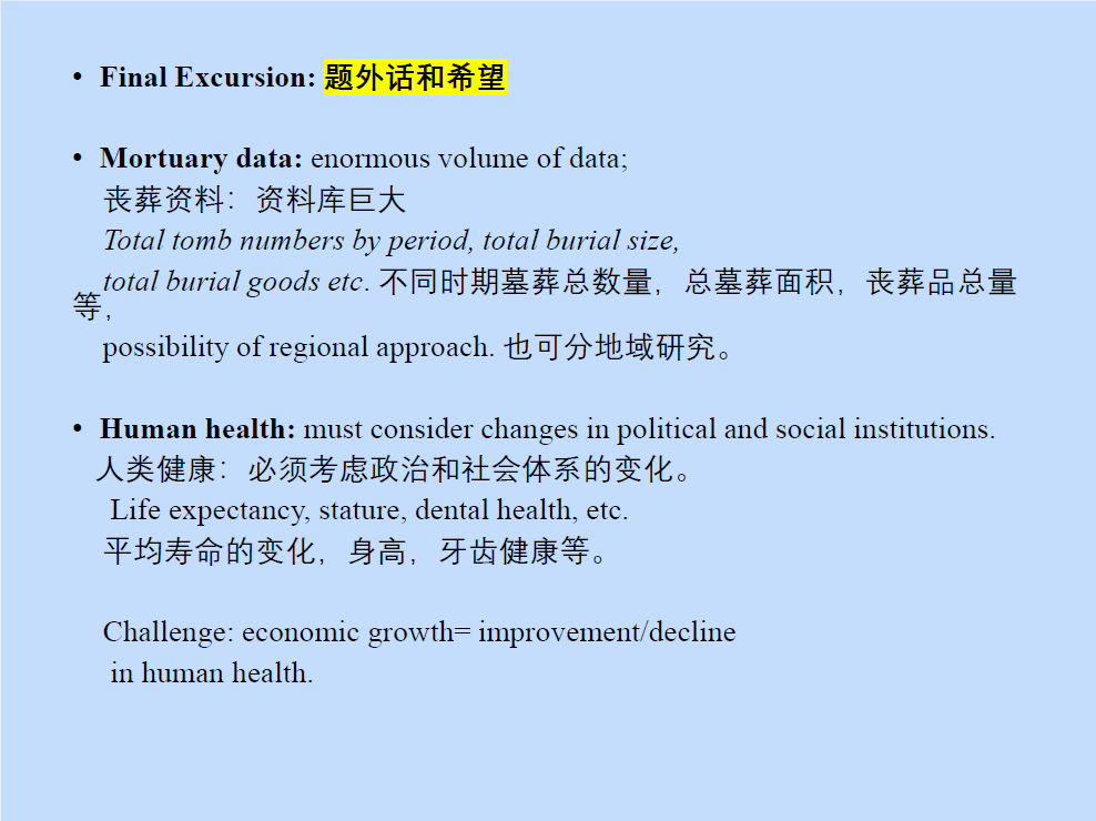 讲座最后,李峰教授对中国古代经济增长这一议题的研究提出设想。第一是研究资料的拓展。在城市以外,丧葬材料的数量丰富,虽整理难度较大,但仍是极为宝贵的资料,可提供不同时期墓葬总数量、总墓葬面积、丧葬品数量等数据,亦可分地域做对比研究。第二是通过人骨材料开展以人类健康作为衡量经济增长的研究,其中包括平均寿命变化、身高、牙齿健康等,同时结合考虑政治和社会体系的变化。