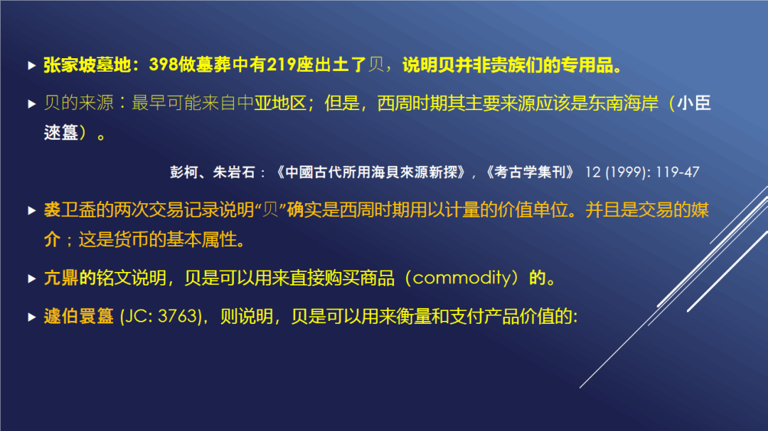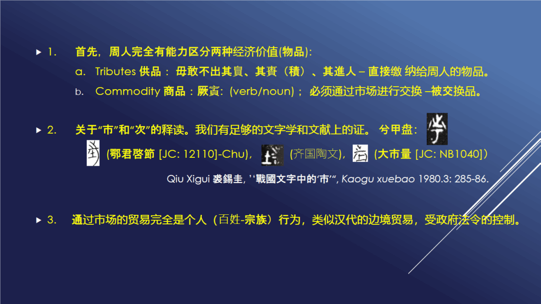 ,两个例子均说明西周时期的大小贵族,从召公到矩伯都在进行交易,交易的媒介是贝。李峰教授认为以上情况与第二讲青铜器生产系统研究所揭示的情况一致,即西周很多贵族宗族在从事生产和属于市场行为的商品交换。这包括高级礼制用品的生产(如青铜器和玉器)、贵族生活实用品的生产(如皮货和车马器械),也包括了面向一般平民的的生产和交换。总之,西周时期市场和商品交换的存在应该是无疑的。