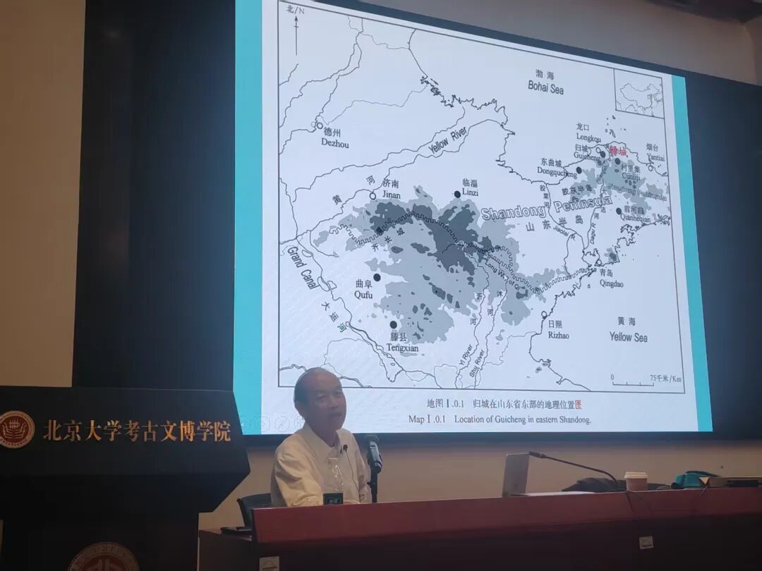 李峰教授先介绍了山东龙口归城遗址。该遗址位于山东省烟台市龙口市黄城东南一带,面向渤海,背靠莱山,地势平坦,东西向约30公里,南北向约20公里。2006年至2012年,中国社会科学院考古研究所、美国哥伦比亚大学东亚语言和文化系、山东省考古研究所三家单位合作,于山东龙口归城遗址进行考古工作。从出土遗物来看,归城遗址的主要文化因素包括以夹砂红褐陶为主的珍珠门文化,以及以泥质灰陶为主的周文化。此外,归城遗址亦是山东地区青铜器最为集中的地方,如1951年归城南阜村出土一盤一匜四盨,为侯嫁女到來莱国之器(《黄县㠱器》,王献唐著)、1969年归城小刘庄出土啓尊及啓卣,记载了记载了启随周昭王伐楚、铸器祭祀祖丁等事。