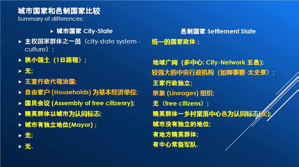 为了更好地理解“邑制国家”与“城市国家”的区别,李峰教授接下来又以典型的“城市国家”——苏美尔和古希腊的考古发现为例,与西周王朝相比较,指出“城市国家”的特点是一群主权相对独立的小型国家存在于一个较密闭的地理空间当中,其缺乏较强大的中央行政组织,王室行政代理治国,以自由家户为基本经济单位,精英群体以城市为认同标志,城市亦有独立的地位。这与西周王朝拥有广阔的疆域,强大的中央行政机构,独立的王家行政,以及以宗族组织作为社会基础纽带,城市缺乏独立地位,精英群体以邑为认同标志,同时存在地方精英群体、中心常备军队等特征完全不同。