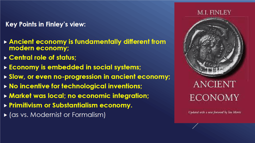 李峰教授先介绍了西方经济史学家摩西·芬利(Moses I. Finley)于1973年出版的《古代经济》(The Ancient Economy)一书,简要概括了书中对古代经济的主要观点。以芬利及剑桥学派所提出 “古代经济缓慢,甚至没有进步(Slow, or even no-progression in ancient economy)”,以及“没有技术革新的动力(No incentive for technological inventions)”这两个观点为引,李峰教授就古代经济增长的议题做概述和讨论。