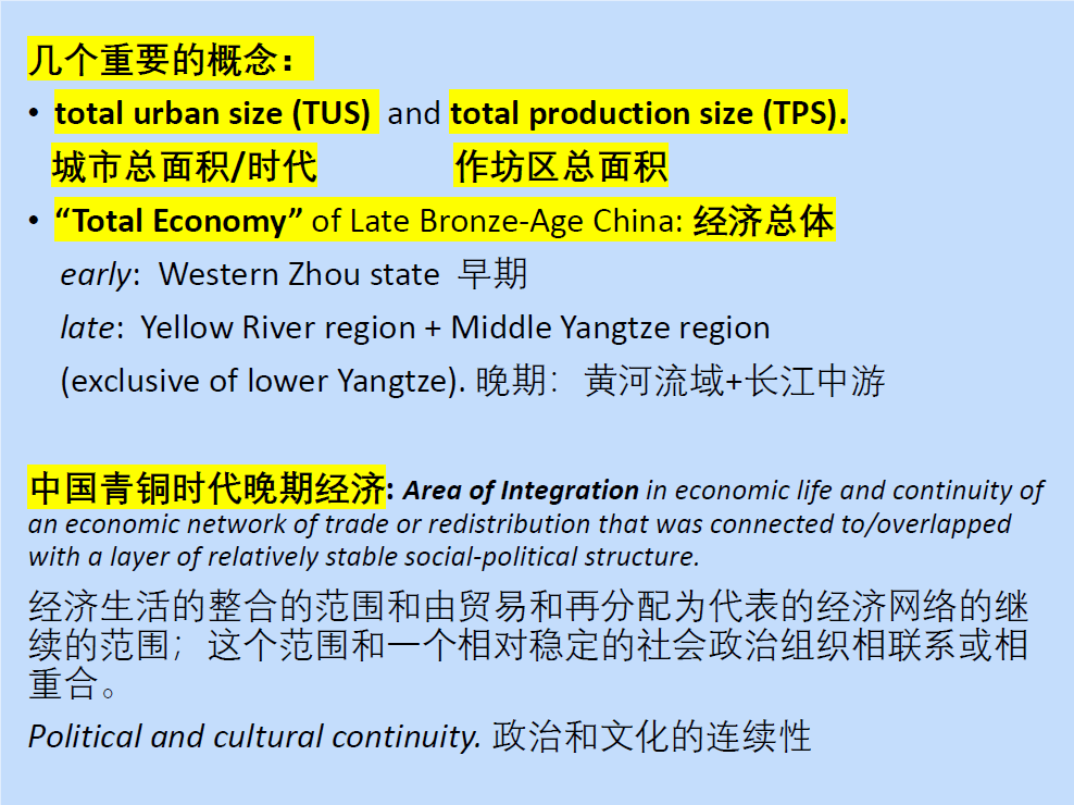 第二,了解经济增长研究中的重要概念,并确定研究范围。李峰教授先介绍了三个相关概念:一个时期中城市的总面积(total urban size, TUS)、作坊区总面积(total production size, TPS),经济总体(Total Economy)。确定用于比较的地域范围方面,李峰教授将早期(公元前1100—800年)定为西周国家的控制区域,晚期(公元前800—300年)则为黄河流域及长江中游一带,并提出各范围需和一个相对稳定的社会政治组织相联系或相重合,同时具有政治和文化的连续性。