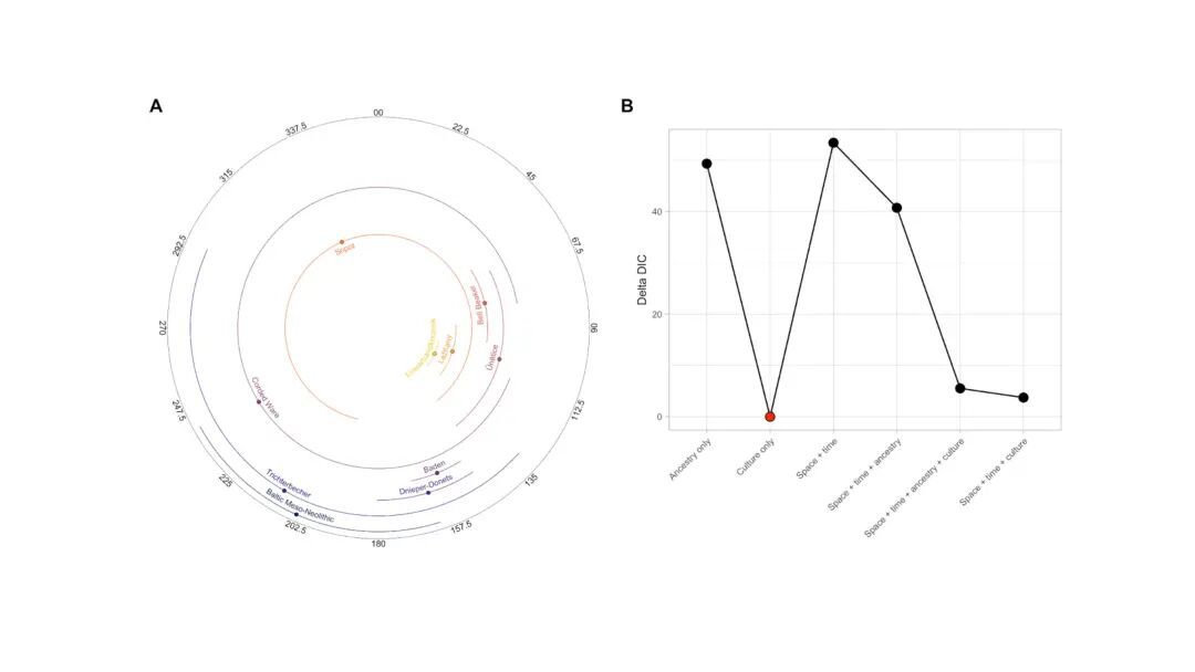 在头向部分,研究采用贝叶斯圆形回归,检测墓葬朝向与安纳托利亚农人祖源比例的关联强度,同时揭示多个考古学文化群体具有各自偏好的头向区间。本次采取从完整模型(Angles ~ 1 + CHG + EHG + LVN + Latitude + Longitude + Age + Culture,其中CHG为高加索狩猎采集人群)中初步剔除协变量的方法来甄别最优拟合模型,结果显示解释头向的最佳模型为“仅含文化变量”,加入祖源或流动性并不会优化拟合结果,而考古学文化归属本身即头向的最佳预测指标。这表明墓葬头向的规范或传统很可能通过从众偏好(conformist)在文化内传递,从而由文化边界出发,形成一定的时空范围。