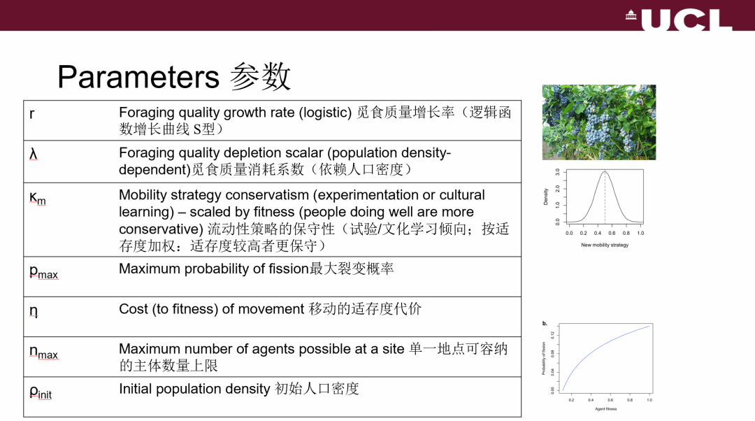 本研究采用基于主体建模的方法对多变量的协同作用开展研究,考察了主体移动频率与环境条件、适存度(可理解为群体的食物供给充足程度)及主体与环境的互动方式间的关系。每个主体都有各自的“流动性策略”,即其在单个时间步内从一地迁往另一地的概率,主体可以从他人处学习或通过试验改变自己的流动性策略。影响主体流动性策略的环境因素被定义为自然资源的觅食质量,它与食物资源的再生速率及狩猎采集人群对于食物资源的消耗速率有关。另一个重要因素是裂变概率,即一个主体分裂为更多主体的概率。当适存度高时,主体就会分裂产生新的主体,而当适存度过低时主体无法分裂并可能最终消亡。适存度会同时影响流动性策略的均值和分布,当适存度低时,流动性策略的均值和方差均较大,导致主体流动性的不确定性较高。反之,在适存度较高的情况下,流动性较低且确定性较高。
