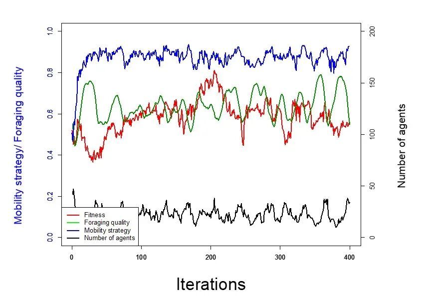 使用两种环境条件下的模拟结果进行说明。首先是在低觅食质量再生率/高消耗条件下,资源易被耗尽且/或恢复缓慢。在这种环境下,主体的流动性策略会迅速提升并保持在很高的水平(蓝线),而主体数量则在低位徘徊(黑线),没有随时间增长,觅食质量与适存度则在中间区域波动(图3)。