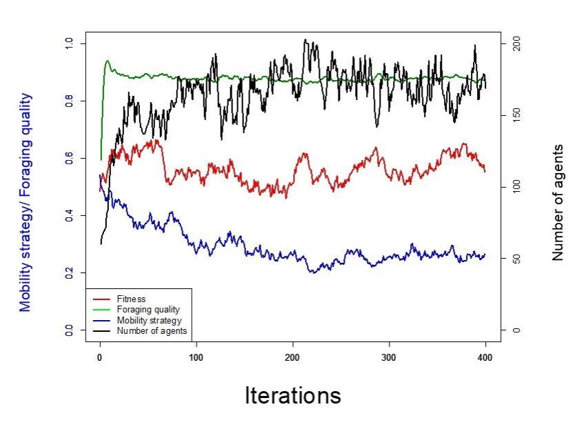 第二次模拟是在环境具有高觅食质量再生率/低消耗条的条件下,此时资源不易被耗尽且/或恢复迅速。模拟结果显示,主体数量逐渐上升且维持在了较高水平,而主体的流动性策略取值则不断下降,显示定居化的倾向。值得注意的是,虽然此条件下觅食质量保持了很高的水平(绿线),但适存度却相对偏低(红线)(图4)。