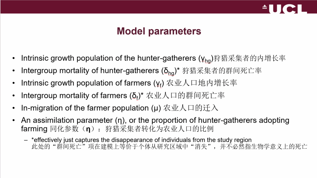 模型的框架使用洛特卡-沃尔特拉竞争模型,这是一对相关的微分方程,每个方程刻画一个群体的人口动态,并包含与另一群体相互作用所产生的影响。模型的两个关键要素是种内(群内)竞争与种间(群间)竞争,可用各自种群的内部增长率、群间的死亡率(竞争导致)和群间的转化率(狩猎采集向农业转化)来进行描述(图6)。另外模型的初始条件,即两类人群的初始比例,对于模拟结果的影响很大。这个取值的变化,可能导致导致不同的模拟结果,包括两类群体(长期或短期)稳定共存,或一方/双方消失。