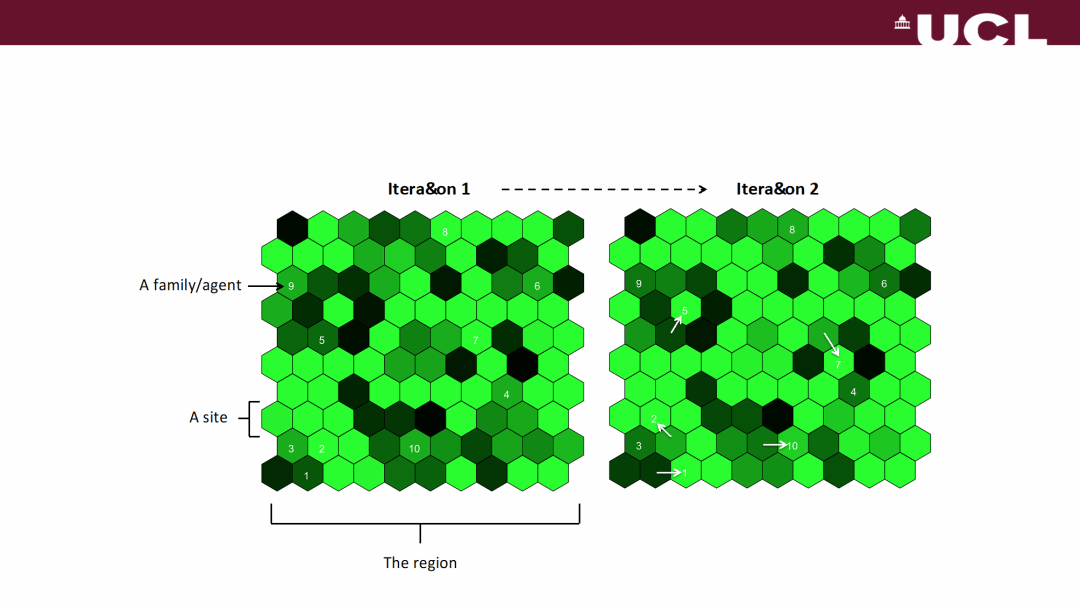在初始化主体的分布后,模型的迭代包含以下步骤:首先更新环境的觅食质量数据,这会导致部分主体消亡,部分主体发生分裂,产生新的主体;之后主体调整自身的流动性策略,进而发生流动;根据新地点的觅食质量数据,又有部分主体消亡;最后再次更新觅食质量数据,重复以上步骤。研究中建立了一个由10×10个六边形斑块组成的网格,作为模型运作的区域,用六边形斑块的颜色的深浅代表觅食质量的高低,建立模型可视化的表达,斑块中的数字表示其中主体的变化(图2)。