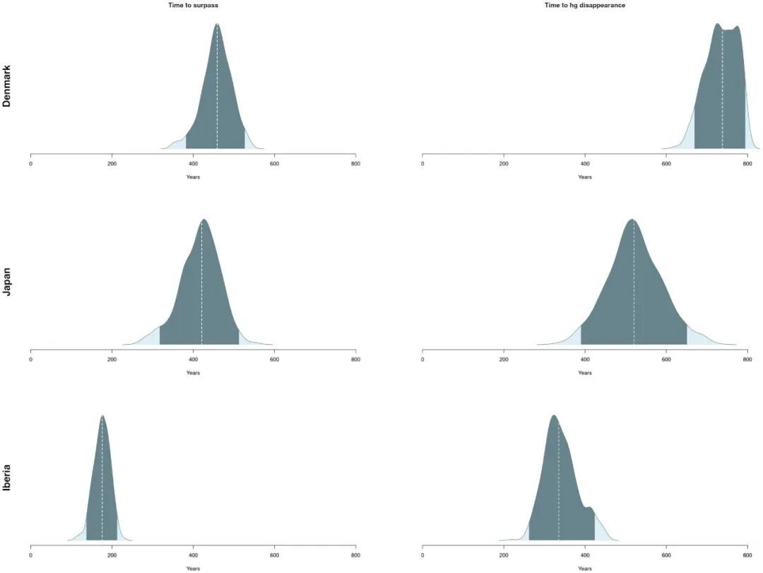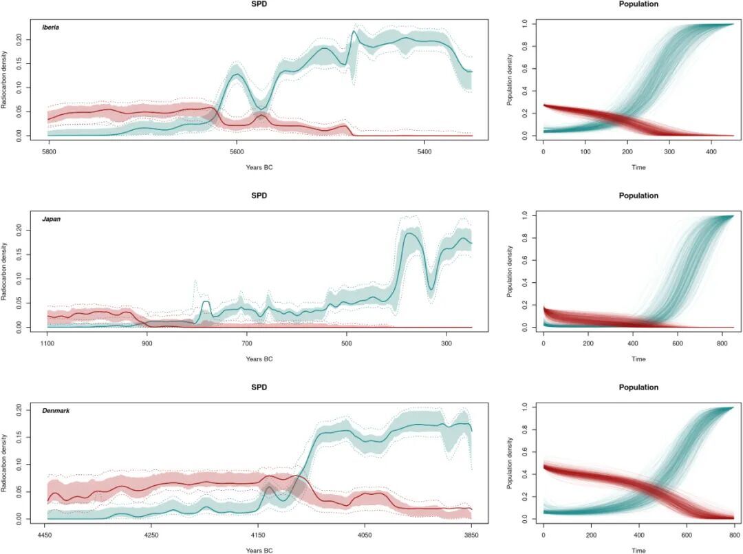 本研究选取了丹麦,伊比利亚东部、日本九州三个区域的考古数据进行案例研究。每个区域建立两条碳十四的累计概率密度曲线,分别对应狩猎采集人群和农业人群的人口变化。将模型得出的最优拟合人口动态转化为碳十四年代汇总概率密度分布,显示三个区域的拟合效果均较好。三个区域的农业人群与狩猎采集人群人口关系显示出明显差异,丹麦的狩猎采集人群数量在初始状态下非常高,在与农业人口发生互动后,发生了迅速的衰减,而农业人口快速上升。日本初始的狩猎采集人群的数量并不多,农业人群人口却上升缓慢,与狩猎采集人群有很长的共存区间,之后随着狩猎采集人群的逐渐消亡,农业人群人口才开始快速上升(图7)。