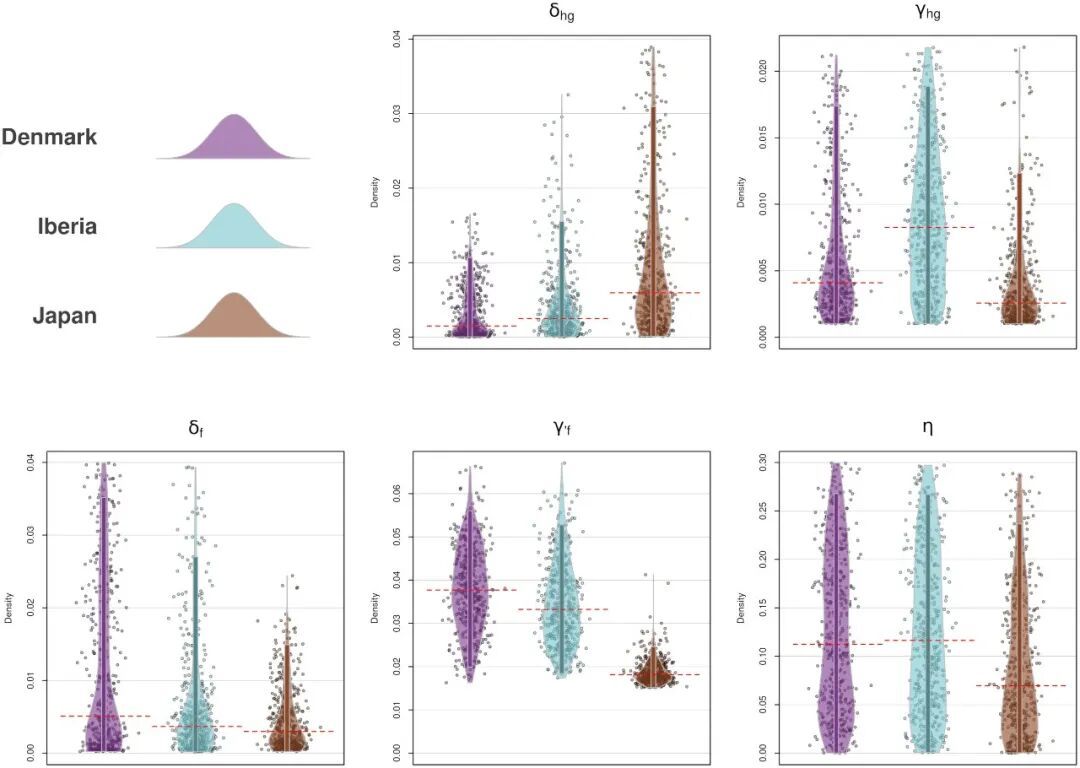 各参数的后验分布在几个区域间也有较明显的区别。比如丹麦和伊比利亚半岛东部的农业人口内增长率γf和群间转化率η明显高于日本,说明日本地区狩猎采集人群很少转化为农业人群,显示了该地区农业传播机制的特殊性(图8)。