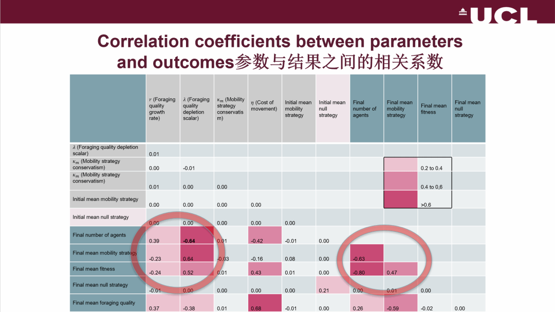 利用相同方式,研究者开展了10万次不同参数的模拟,并对参数与结果之间的相关性进行了分析。结果显示,觅食质量消耗系数与流动性策略指示呈正相关,说明环境较差时人群更倾向于流动,反之则倾向于定居;主体数量与流动性策略指数呈负相关,说明更加定居的人群人口数量一般较高(图5)。这些观察与我们既往对于狩猎采集人群流动性的认识相符。