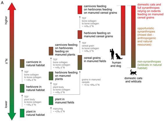经过对不同阶段数种不同动物的碳氮稳定同位素分析后可以发现,不论非洲野猫/家猫还是欧洲野猫的食谱在铜石并用时期较新石器早期更不均衡,它们捕食了更多与人类聚落共生的动物,而非野生动物。若将罗马时期包含在内,则可以发现在早期新石器时代,猫的氮值显著低于人类和聚落内的狗,但在罗马时期,猫的氮值则显著高于人和狗,说明猫在此时已经主要依赖人类聚落提供食物。因此,稳定同位素的证据进一步肯定了家猫在新石器晚期阶段才与人类共生,并在罗马时期形成驯化,而在新石器时代较早阶段非洲野猫成分的出现应与人类关系较弱。