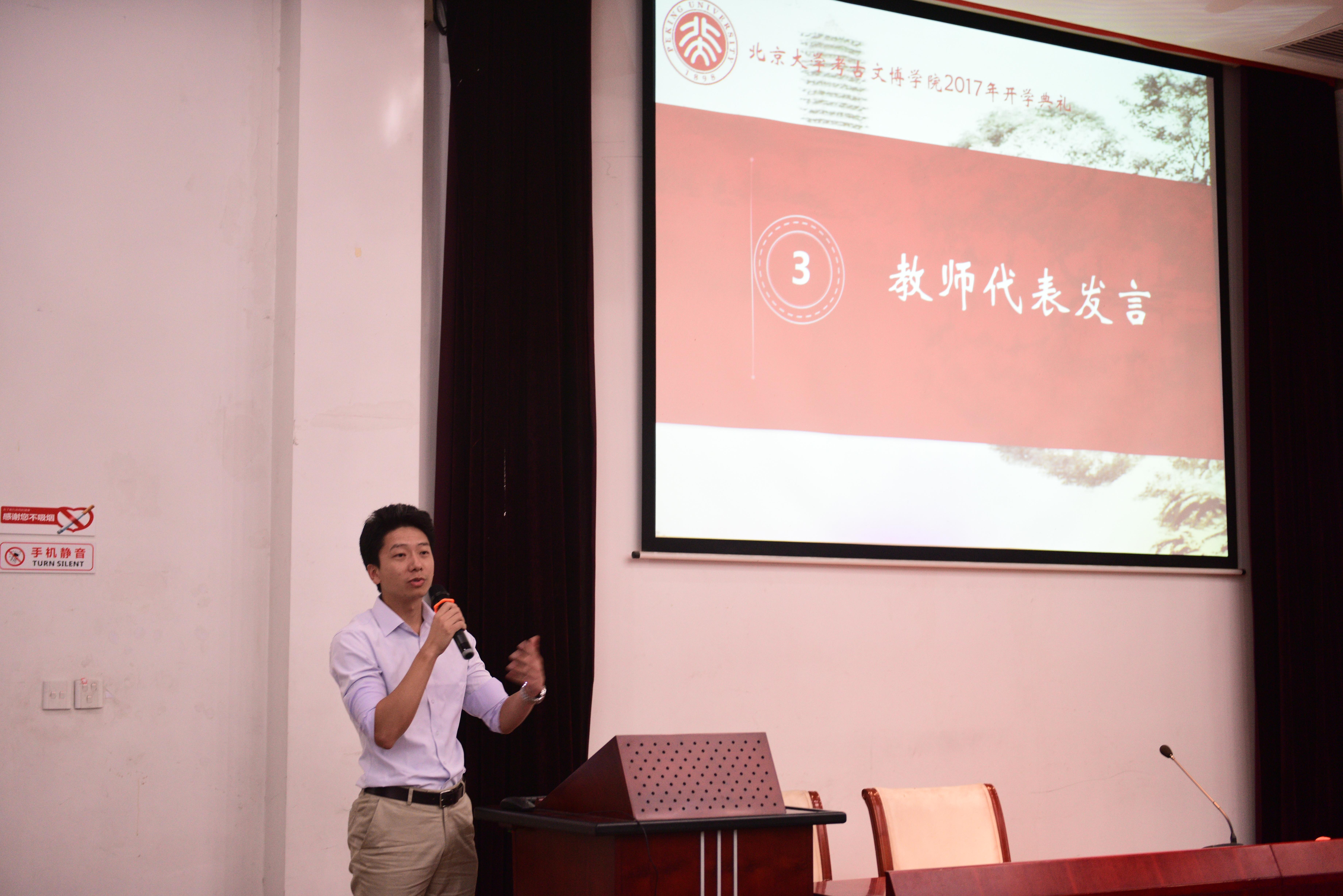 两位教师代表,张海老师结合自己本科读书期间在昌平学习的经历,宿舍生活的体验,北大舞台剧《未名湖是海洋》的启发以及田野考古的专业实践收获,勉励新生珍惜时光,放平心态,在抓好专业学习的同时,注重综合素质提升和保持良好的业务爱好。张剑葳老师结合自身经历,鼓励新生不拘小节,返璞归真,追求真理,突破局限,培养创新性思维和自醒性习惯,扛起公众考古的责任旗帜,传承历史,继承文化,激发活力,再现考古人特有的精神魅力和文化感召,秉持学习,突破和创造的不懈进取状态。