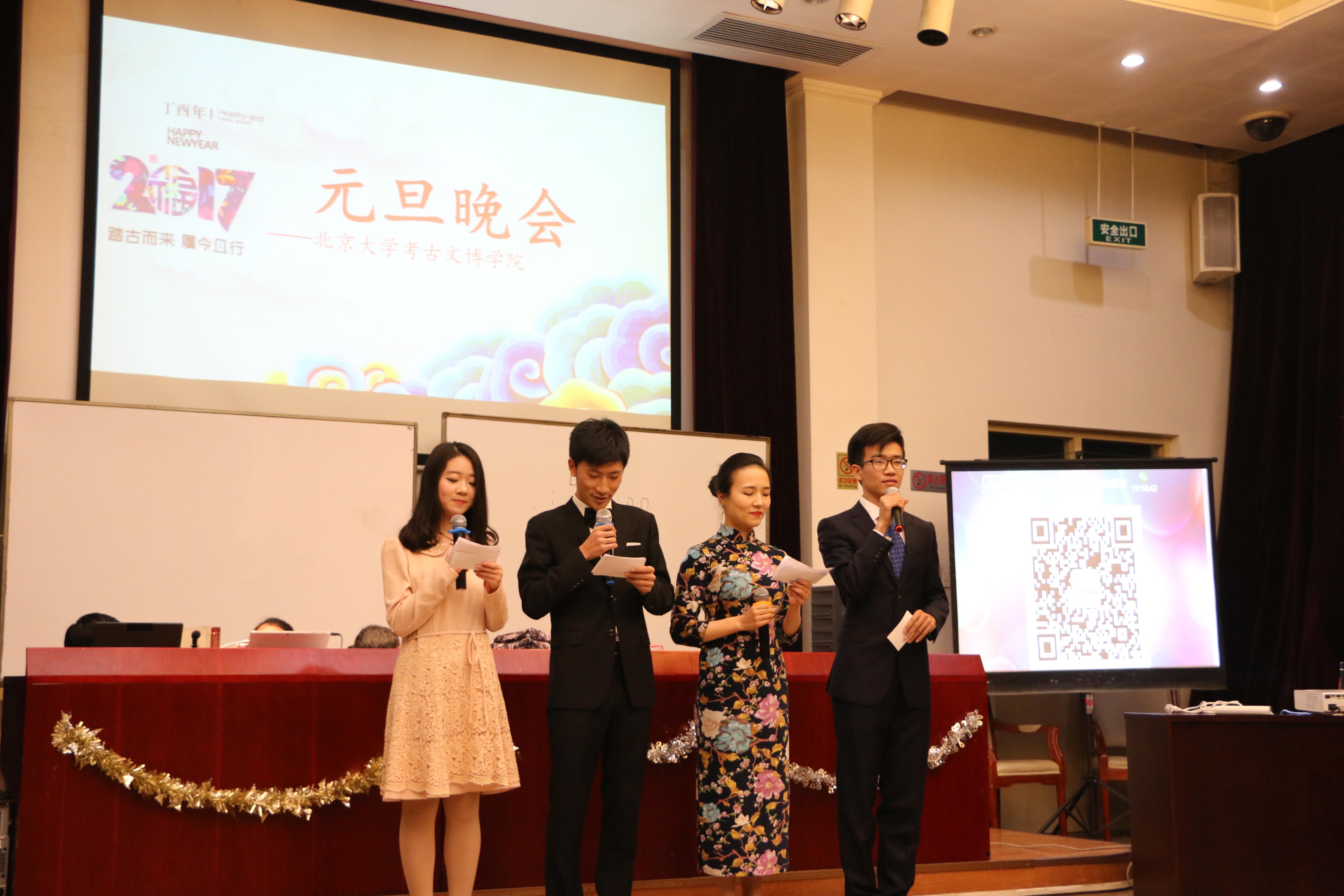 2016年12月17日晚6:30,北京大学考古文博学院元旦晚会在考古文博学院A座101室成功举办。学院院长杭侃老师、副院长孙庆伟老师,北京大学中国考古学研究中心主任徐天进老师、离退休代表晁华山老师、李淑霞老师,院长助理施文博老师,2016级本科班主任张剑葳老师,院团委书记户国栋等与学生共迎元旦。