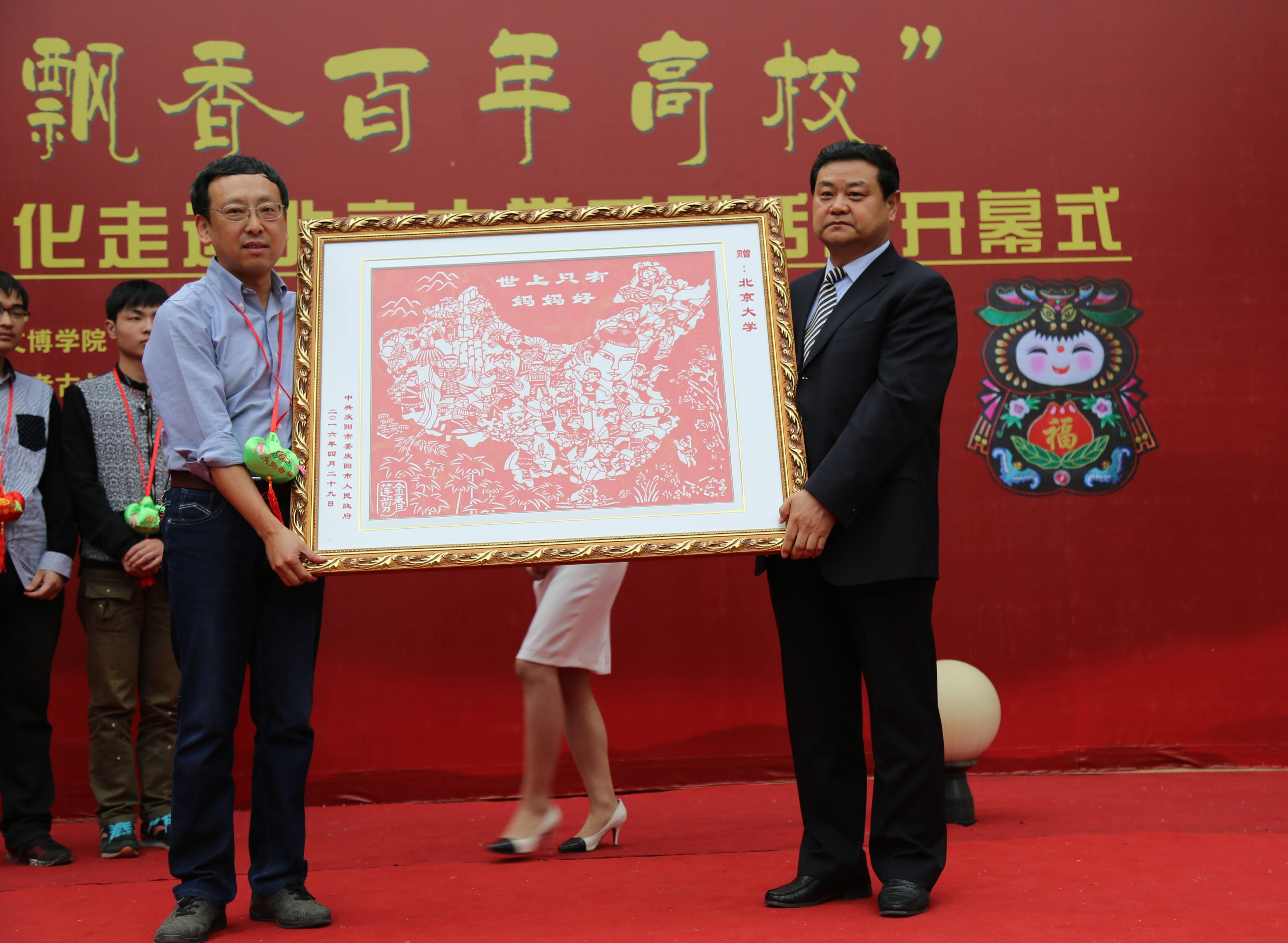 ▲开幕式上庆阳市文化馆向北京大学考古文博学院捐赠精美剪纸