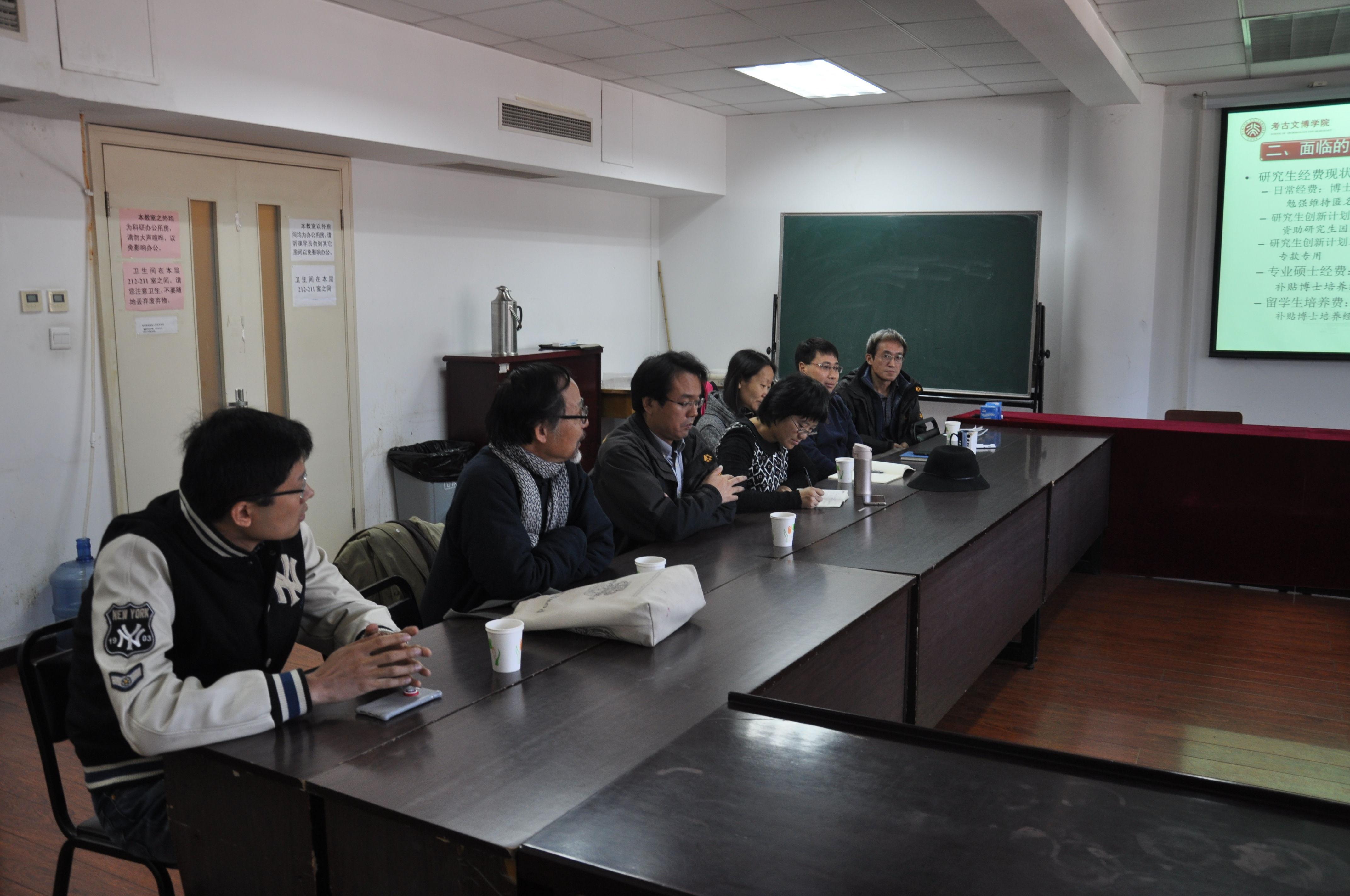 2015年10月30日,研究生院龚旗煌常务副院长、刘明利副院长、王天兵副院长率胡晓阳、贾爱英、王小玥、张辉等各个办公室主任到我院调研研究生培养情况。我院主管教学的张弛、孙庆伟副院长,主管科研的吴小红副院长,中国考古学研究中心主任徐天进教授,考古学系主任张海和文化遗产学系主任陈建立等诸位老师参加。我院由张弛老师介绍学院、学科及研究生教育情况,之后双方就我院在招生生源、培养模式、培养经费、学科建设等方面提出的问题进行讨论。会上研究生院诸位老师提出宝贵建议,实际地解决了不少问题。此次调研我院受益良多,希望以后能与研究生院保持沟通,提高研究生教育水平。