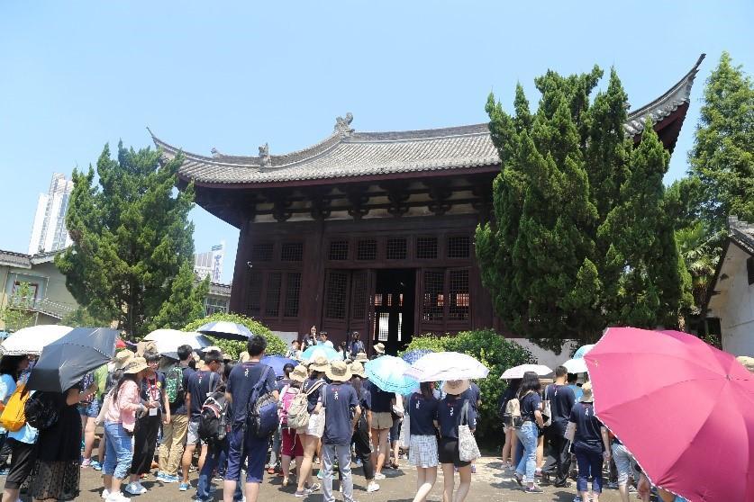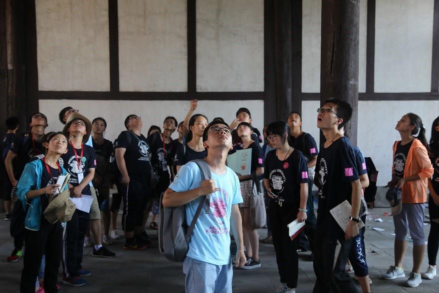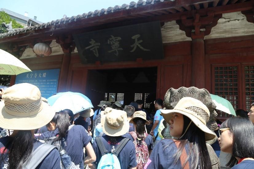 来到金华,已近十点,阳光替树木剪影,夏天镀了同学们一色的黄金。那天宁寺,坐落在喧闹的金华街头,历史就这样与城市鲜活共存着。同学们越过山门,走上台阶,元代遗构,就在眼前。讲解由三位古建老师带领,九脊佛殿,梭柱侧脚,缓合生起,肆意出檐,好个天宁古寺。再看那斗栱,一跳偷心,二跳重栱,三跳承檐,好个单杪双昂。都说元代建筑粗放不羁,今日一见,果真如此。迈步进入大殿,彻上明造,可见月梁,前后劄牵,乳栿并长。这抬梁式,已经运用的炉火纯青。仔细端详,梁的下皮还有墨书题记,这可是古建研究的可靠资料啊。同学们抬着头,仔细地看着那梁栱斗枋,独特的造型,完美的结合,看得人如痴如醉。这,就是中国古建筑的魅力。