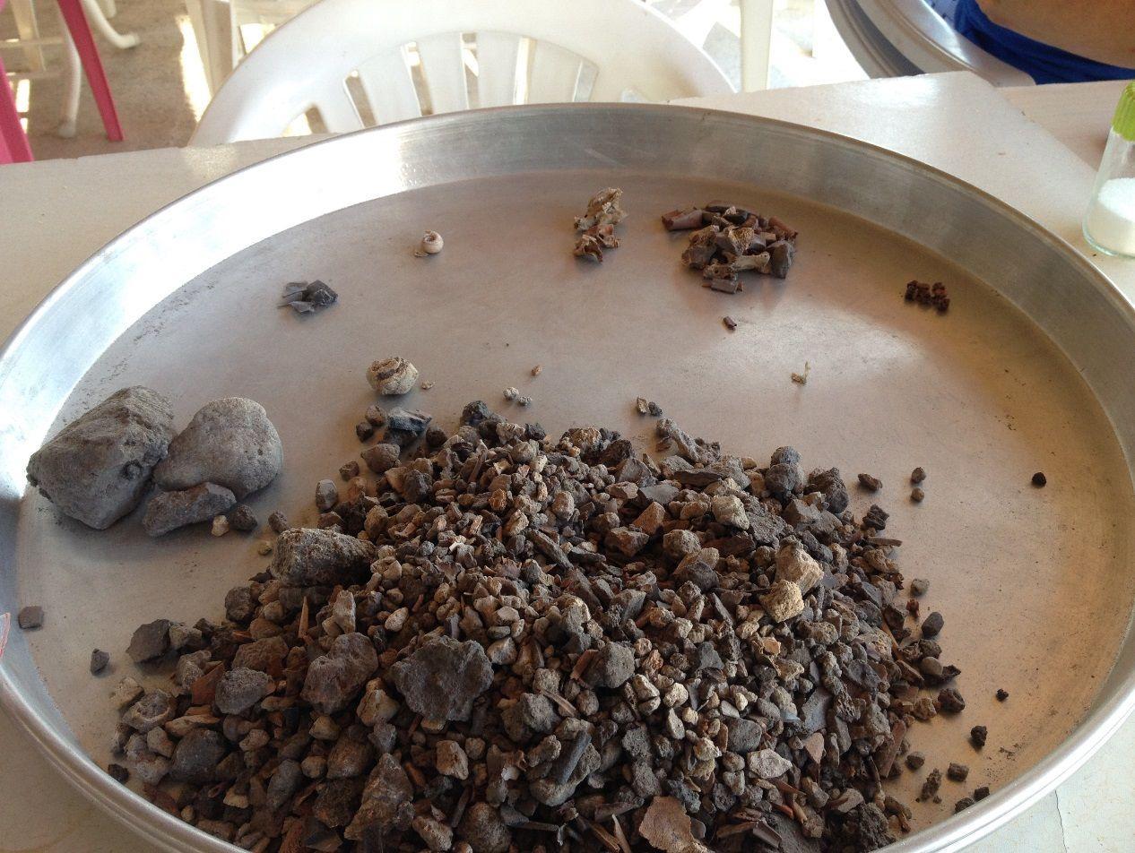 浮选出的轻浮物用纱布包好后晾在浮选机旁的绳子上阴干;重浮物与湿筛后的遗物则在帐篷南侧空地上晾晒。重浮物干燥后倒入大托盘内进行遗物分类,拣选出人骨、动物骨骼、黑曜石、朴树种子(hackberry)、贝壳、蛋壳、建筑构件(structural)等,按类别分别用小封口袋包装好后,装入该单位对应的大封口袋内。