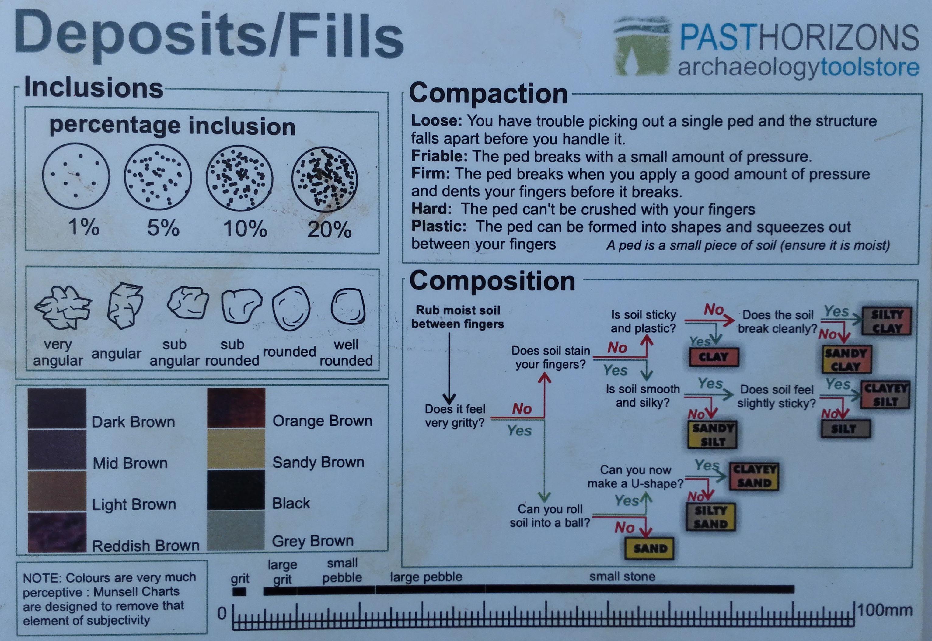 记录表格的程序化这点与国内做法类似,需要填写小件登记表和context记录表。而在现象描述方面,英国则显得更为准确。一般我们对土壤的描述主要是土质、土色和包含物三项,使用的多为描述性词汇如软硬,深浅,多少等,标准并不统一。多切斯特遗址上于此有严格的判断标准,如土壤质地分为Loose(松软)、Fariable(易散)、Firm(坚硬)、Hard(生硬)、Plastic(可塑)四类,每一类都对应有手感的描述,可以参照进行选择(图九)。土色描述时除形容性词汇,如棕黄、棕色外还使用比色卡确定不同色号,如此则可以达到统一标准(图十),避免因个人因素造成过大偏差。