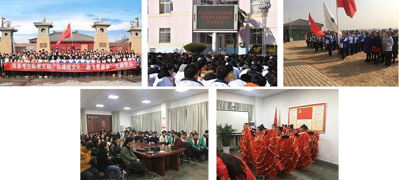 2017年12月27日,扶风县委组织部与周原考古队举办党日活动,来自扶风高中、扶风二高、法门高中的教师、学生代表走进周原考古基地,参观考古现场、举行座谈会。师生们还为周原考古队送来精彩表演。2018年1月8日、9日,周原考古队学生代表又走进上述三个高中,与高中生分享学习心得与大学、实习生活体验。