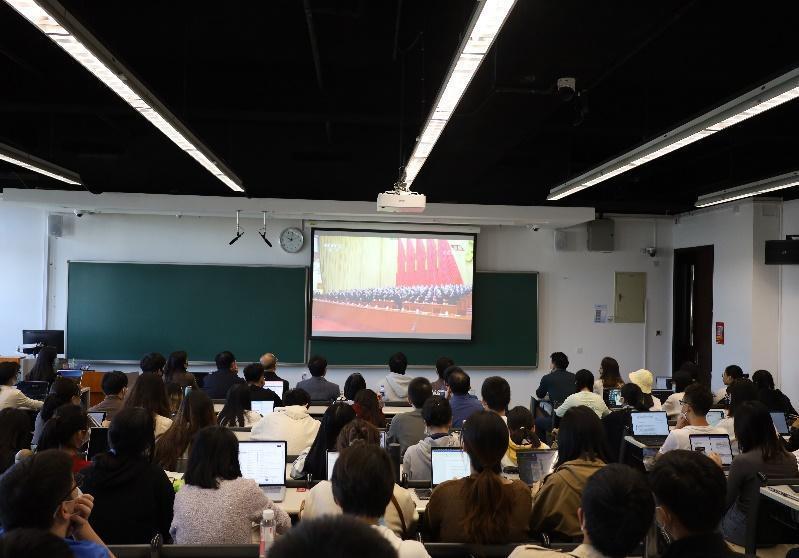 考古文博学院共设立了北京大学燕园校区、山东临淄田野考古实习基地和线上三个分会场进行收看。考古文博学院院长沈睿文、党委书记陈建立、副院长张剑葳、党委副书记曹蓓与学院党委委员、教师党支部书记和教师代表、全体学生党员和入党积极分子早早齐聚二教401,认真听取大会报告,领悟会议精神。