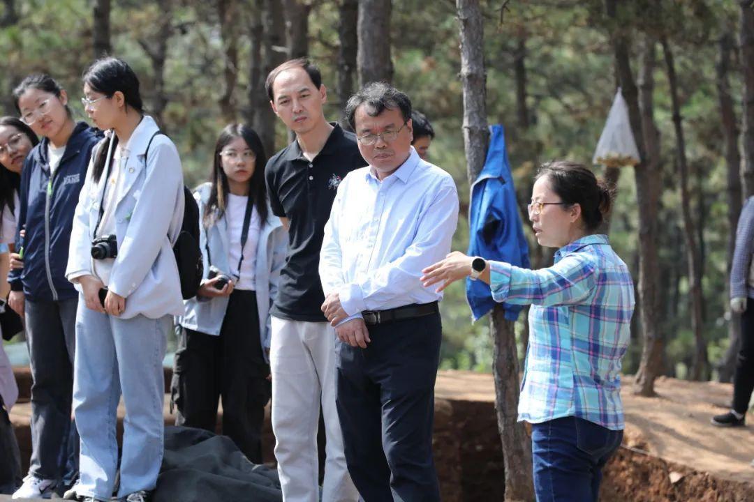 在遗址的第一、第二地点,师生还在中国社科院考古研究所世界考古研究室主任贾笑冰,辽宁省文物考古研究院研究馆员、牛河梁遗址田野考古项目执行领队郭明引导下,参观调研遗址保护与展示工程,细致观摩“坛庙冢”的特征,了解遗址周边新探方的发掘情况。