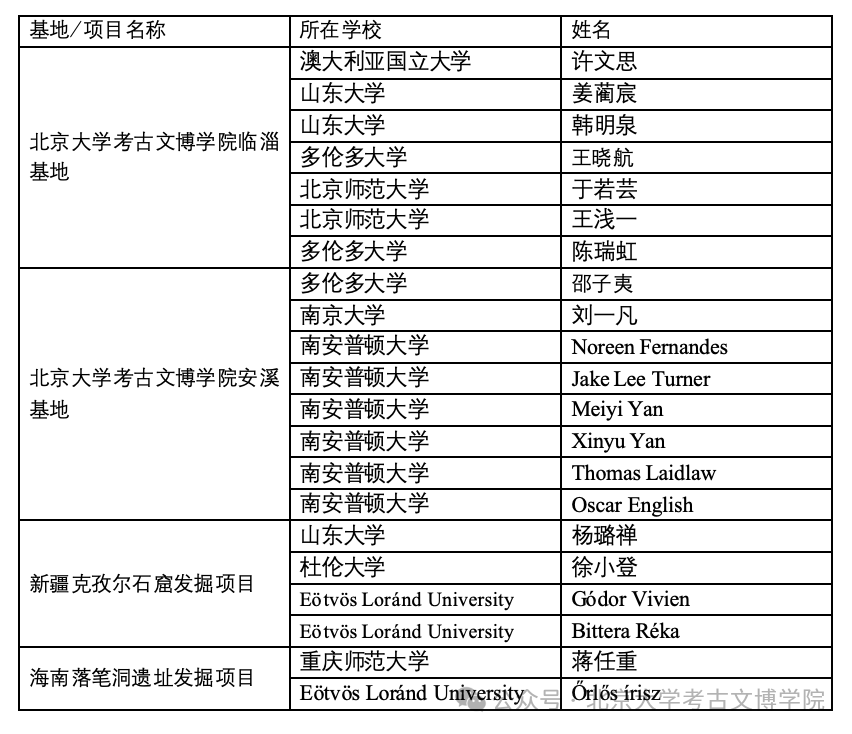 本年度临淄基地、安溪基地、新疆克孜尔石窟项目及海南落笔洞遗址发掘项目开放交流项目,申请的学生来自多伦多大学、南安普顿大学、杜伦大学、澳大利亚国立大学、山东大学、南京大学等十余所高校,经项目负责人对申请人材料审核、学院党政联席会审议,本次共有21名学生入选该项目。名单如下: