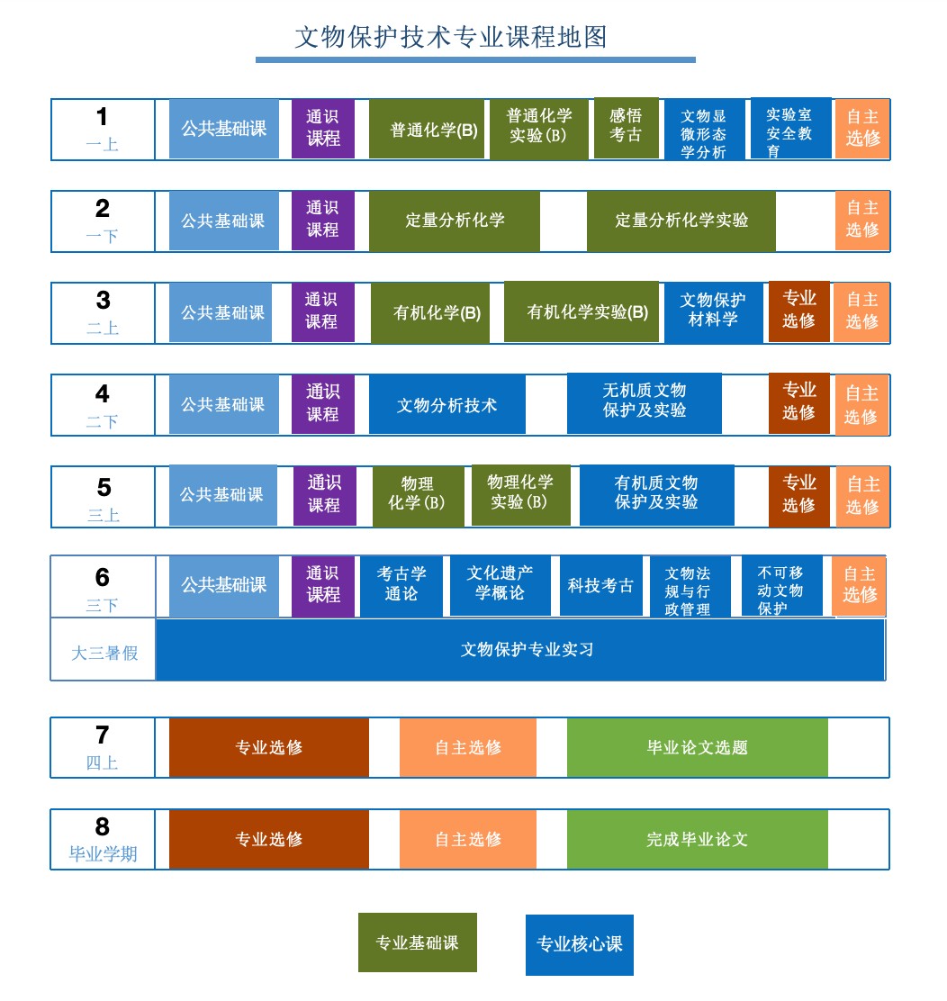 文物保护专业致力于培养具有良好人文素养和科学素养,能根据文物保护原则利用自然科学手段开展文物保护工作的高素质复合型人才。本专业学生不仅要掌握化学类专业所具备的知识与能力,还要掌握和理解考古学、博物馆学的相关基础知识,以文理综合的思维方式对知识融合运用,建立对文物的多元理解与认识,培养从事文物保护研究与文物保护修复实际工作的能力。